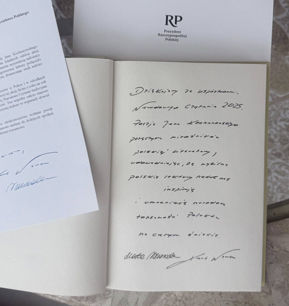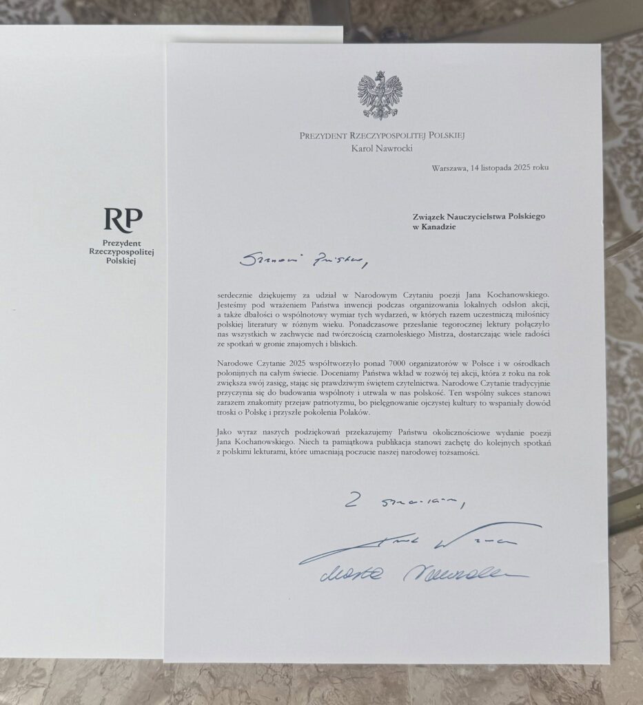 Przed Świętami Bożego Narodzenia Związek Nauczycielstwa Polskiego otrzymał w ramach podziękowania za udział w Narodowym Czytaniu wyjątkowy tomik poezji Jana Kochanowskiego ze specjalną dedykacją, a także list z podziękowaniami od Prezydenta Rzeczypospolitej Polskiej, pana Karola Nawrockiego, oraz Pierwszej Damy, pani Marty Nawrockiej.